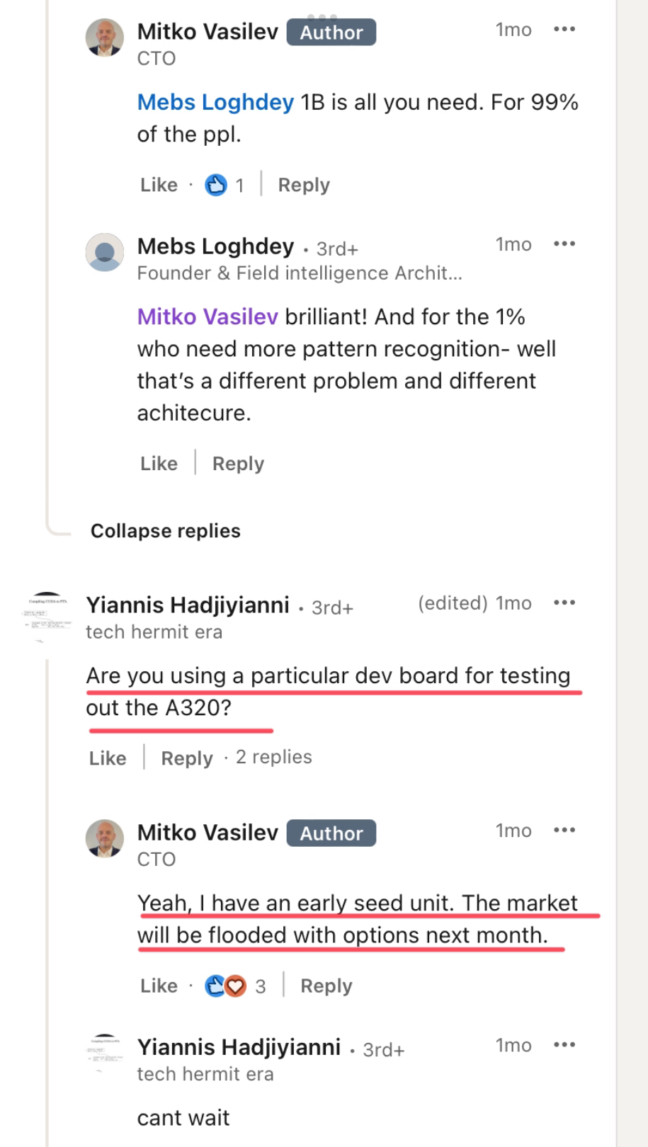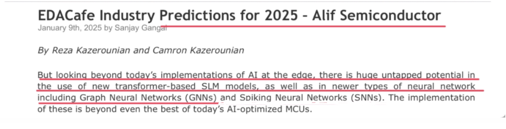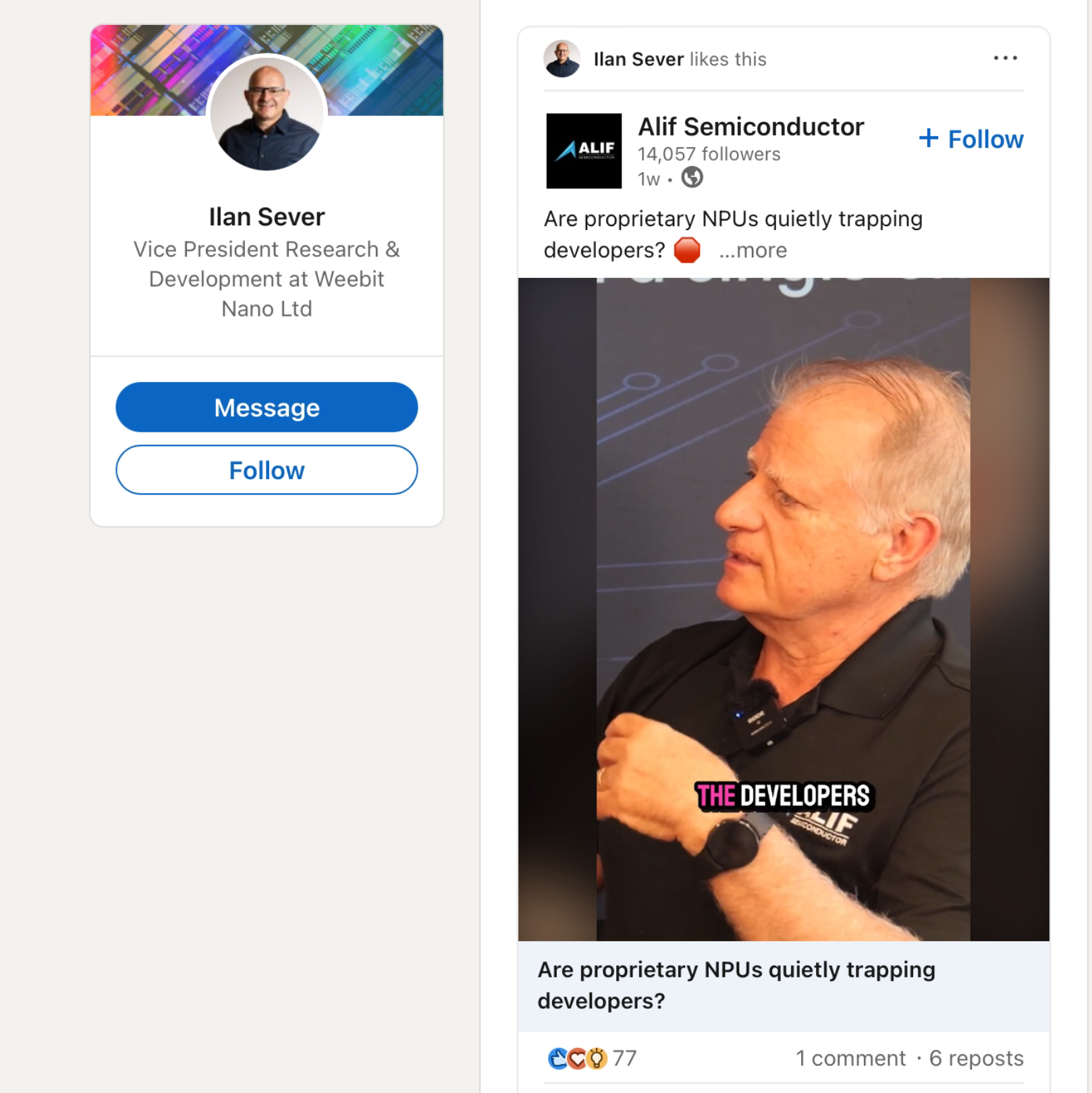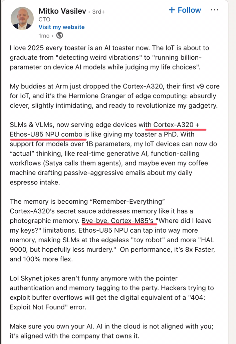 WeeBit Nano’s Vice President of Research and Development liking Alif Semiconductors co founder Reza’s video on why those with in house proprietary NPU’s are not providing the benefits to developers compared to company’s like Alif who externally source the latest advanced NPU technology , as in Alif’s case the Arm Ethos U85 .
