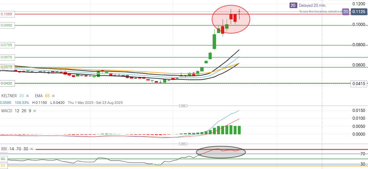 but I feel with the reducing volume and RSI now in retreat that at best sideways action is to be expected .Volume seems to be dropping off now back to normal levels . Will be interesting to see what happens here now the Rock stock interview helped to sustain further buying but I feel with the reducing volume and RSI now in retreat that at best sideways action is to be expected .