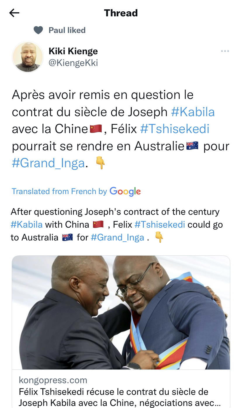Félix Tshisekedi rejects Joseph Kabila's contract of the century with China, negotiations with the Australians on Grand Inga
