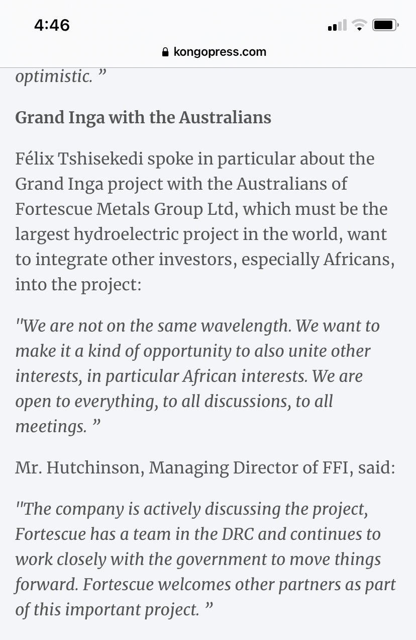 "The company is actively discussing the project, Fortescue has a team in the DRC and continues to work closely with the government to move things forward. Fortescue welcomes other partners as part of this important project. ”