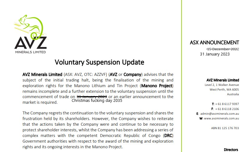 Felix sees the problems in the mining industry and is working to resolve them. But there is a process that must be followed and limits to what even the President can do without becoming a dictator. Felix has fired some of his personal advisers and is about to have the ministers accused of corruption by the IGF removed from government. He has also tackled unfair contracts that have benefited China over the DRC. He didn't have to do any of this. I understand people's frustrations and we would all love to see imminent progress for AVZ. But I'm not sure what else you guys think Felix should be doing right now.