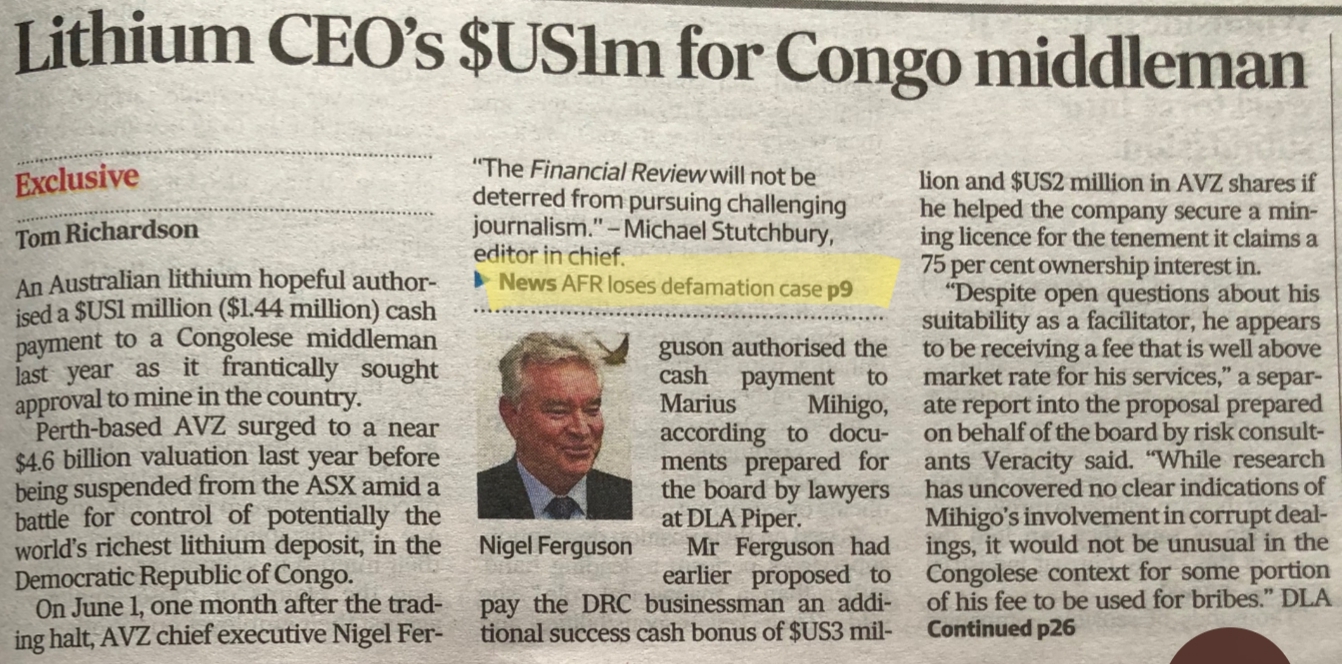 Over the last 6 years in the DRC, AVZ have carried out Soil Sampling, Field Mapping, Consulting, Drilling, Metallurgical Testing, Completing a FEED Study, Environmental Study and Impact Assessment Reports including Groundwater Management, a 160 page Definitive Feasibility Study, a SEZ Agreement, Tendering for Mining Infrastructure, Legally Obtaining and Paying For an Increased Share of Dathcom, Obtaining Several Offtake Agreements for both Lithium and Tin, Raising Capital, Negotiating Funding with Pan African DFI’s and a Funding and Offtake Agreement with CATH, Presenting at the Battery Minerals Conference, Legally Fulfilling all Requirements to Obtain the Mining License, Including Receiving the Ministerial Decree to Award the Mining License and producing an 85 page Sustainability Report, Spending millions of dollars and Supporting the Local Community….