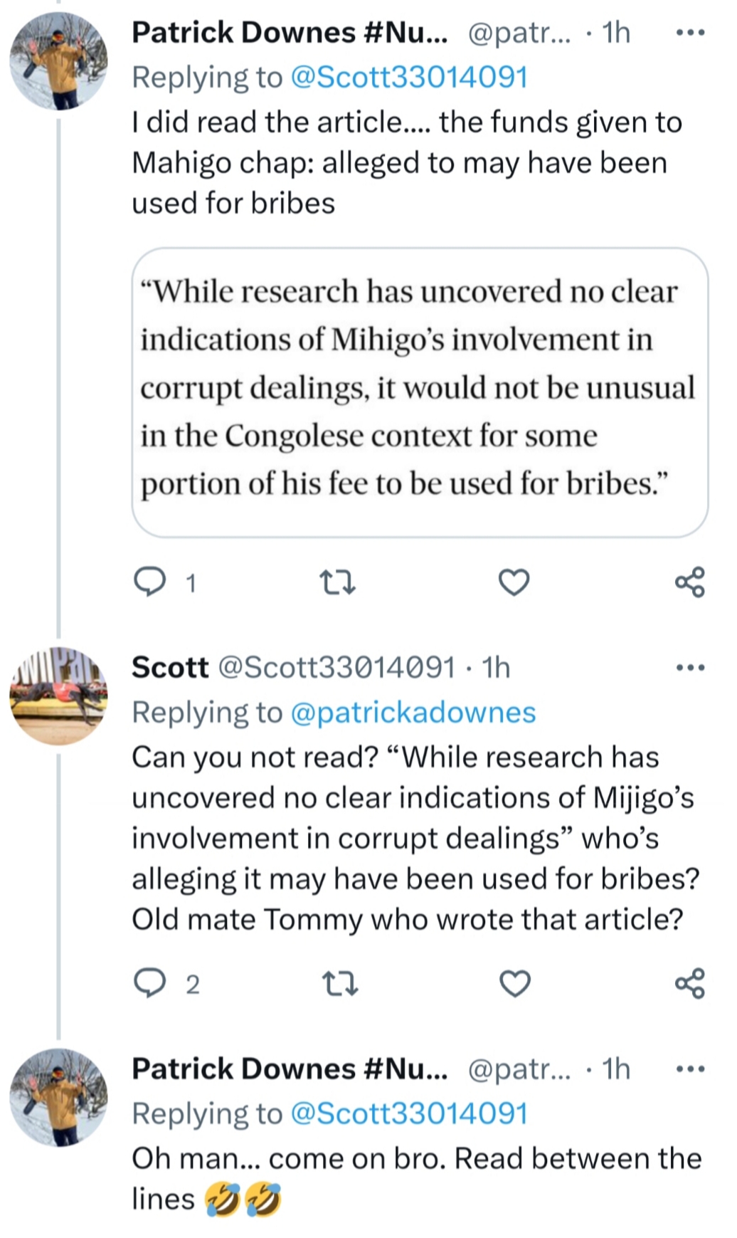 If I really wanted to know what was going on I would go to Kinshasa and knock on Felix's door. Is anyone from AVZ actually in the DRC? Is Felix back in the house or having a meeting with the mining minister of Tahiti on the way home from South Africa?