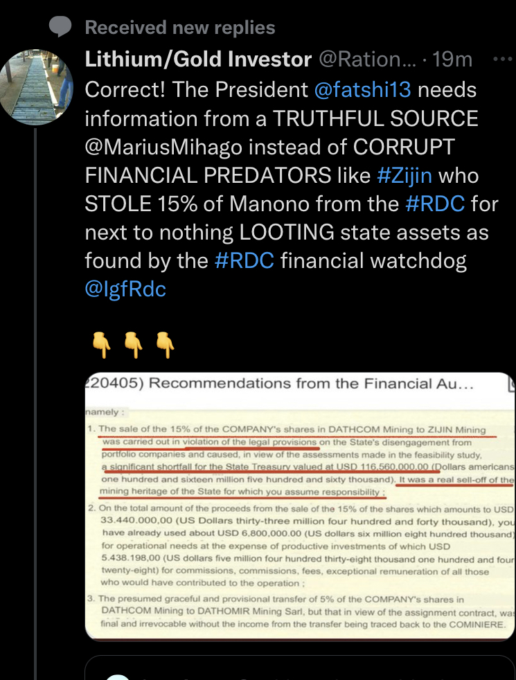 Space bar mateI think we should finally learn now that the president is not our rescue hammer and can not work against so many bad people in his government in the same time. He is the first president after a long kabila regime. The MoP is against us for many months now, the MoM clearly showed that she has enough and want the project go forward. I think the government don’t care if with us or without us. All that fighting against cominiere and zijin instead of working for a relationship had bring us in the situation that they finally try to get the complete license back. They had 18 months to cancel the deal with zijin but nothing happened in our favor, after two times the MoP accused by the IGF she is still there. I’m not sure why I was so blind and imagined that a few people and a little company have a chance to change this corruption influenced by the Chinese. The world know about the image of the drc, nothing will change and nobody care if they kick us out. I’m not sure how anyone can believe that everything will go in our way. I can’t believe they restore the complete license and give a new decree, the unwilling of working with each other still exist. The government would not benefit. Zijin would work with us they don’t care and want to make money with the project, maybe they would take us over later but who cares. If we don’t come to a agreement I don’t think the government will wait many month’s until the ICC is settled. Their people are dying and they need money, and a little Australien company don’t want to work with corrupt guys (what I completely understand but what choice did we?) and this generates a situation nothing can go forward. The president, the prime minister, the MoP or MoM could give their best to cancel that deal and show they are behind us. But they didn’t. Our lawyers or marius didn’t changed the situation. What else can we do anymore than just accept the situation and take zijin money what would help to start with the project? Go to ICC and claimed for money the next years? The government showed they can’t be trusted. We can loose all our money or make a agreement with this assholes and hope it’s not to late for it. I’m the first one who hope the best but I’m the first one too who can accept when a fight is lost. even if you want to shoot against me, but I think the management misjudged the situation and hoped they working in accordance with the law.