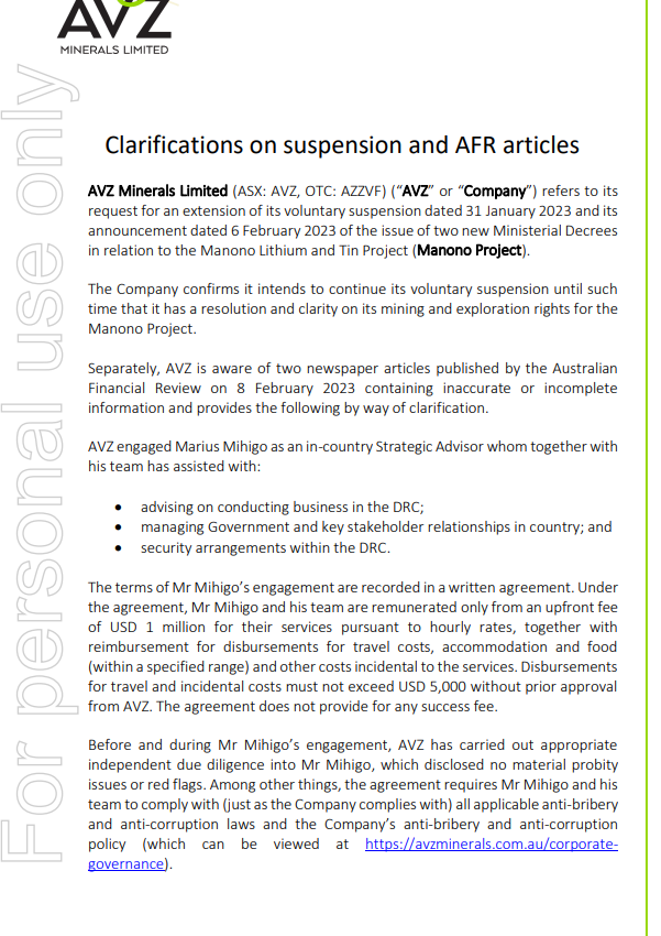 "The Company confirms it intends to continue its voluntary suspension until such time that it has a resolution and clarity on its mining and exploration rights for the Manono Project."