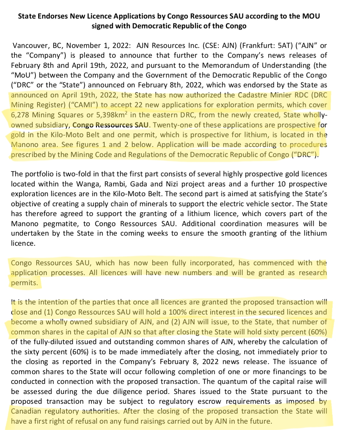 The DRC government will end up owning 60% of AJN. Any buyout by Zijin will still include the DRC government at 60%. It's a better deal for them and they maintain control of half the resource for their battery plants. So the state ends up holding at least 10% of RD and 60% of CDL instead of 10% of the whole tenement.