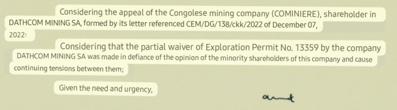 I've been unable to find anything in the mining code relating to whether cancelling a decree using a section of a JV agreement as a reason is allowed or not but Section 1.1 of the Dathcom SEF or something similar in the Dathcom JV agreement (which I don't have a copy of) is what she is talking about in the new decrees imo