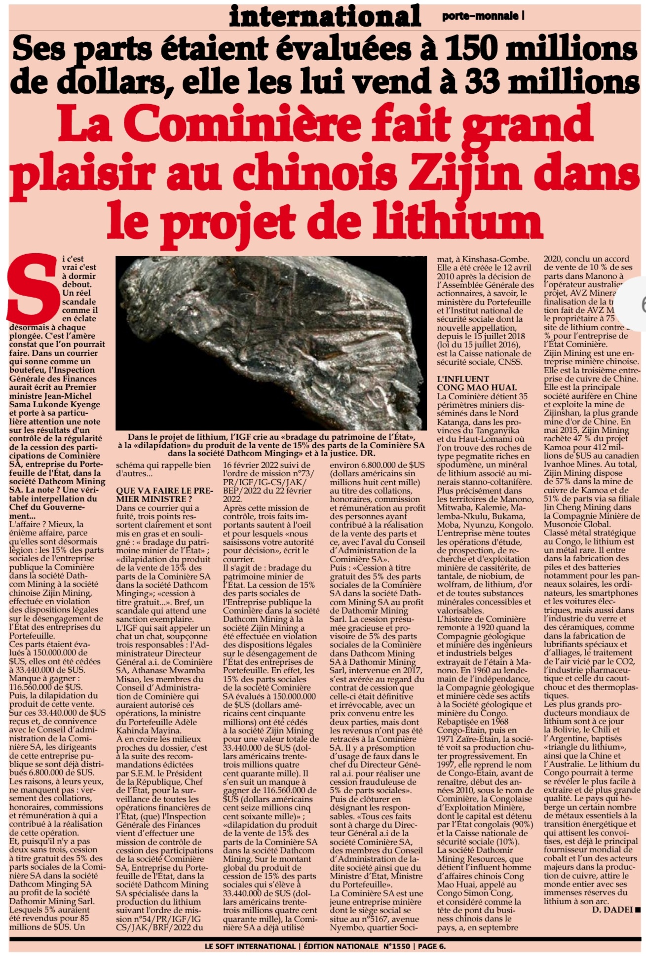 According to circles close to the case, it is following the recommendations issued by HE the President of the Republic, Head of State, for the supervision of all the financial operations of the State, (that) the Inspection Générale des Finances has just carried out a mission to control the sale of the holdings of the company Cominière SA, State Portfolio Company, in the company Dathcom Mining SA specializing in the production of lithium according to mission order no. 54/PR/IGF/lG CS/JAK/BRF/2022 of February 16, 2022 followed by mission order n°73/PR/IGF/IG-CS/JAK/BEP/2022 of February 22, 2022.