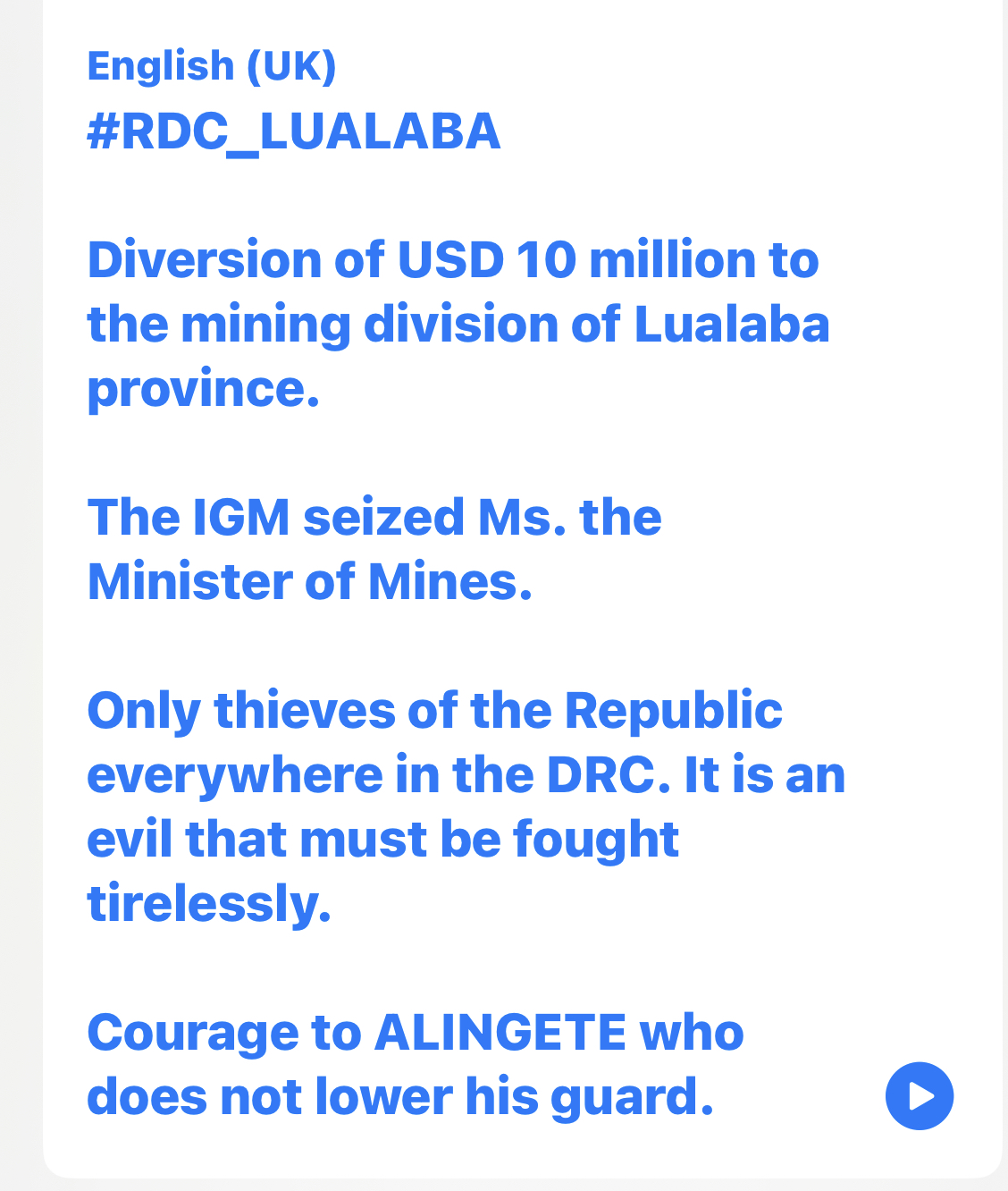 I suspect the 2024 comment in the AVZ update and supporting words around AVZ waiting for things to be sorted in the ICC will seriously put the wind up the DRC and Felix.