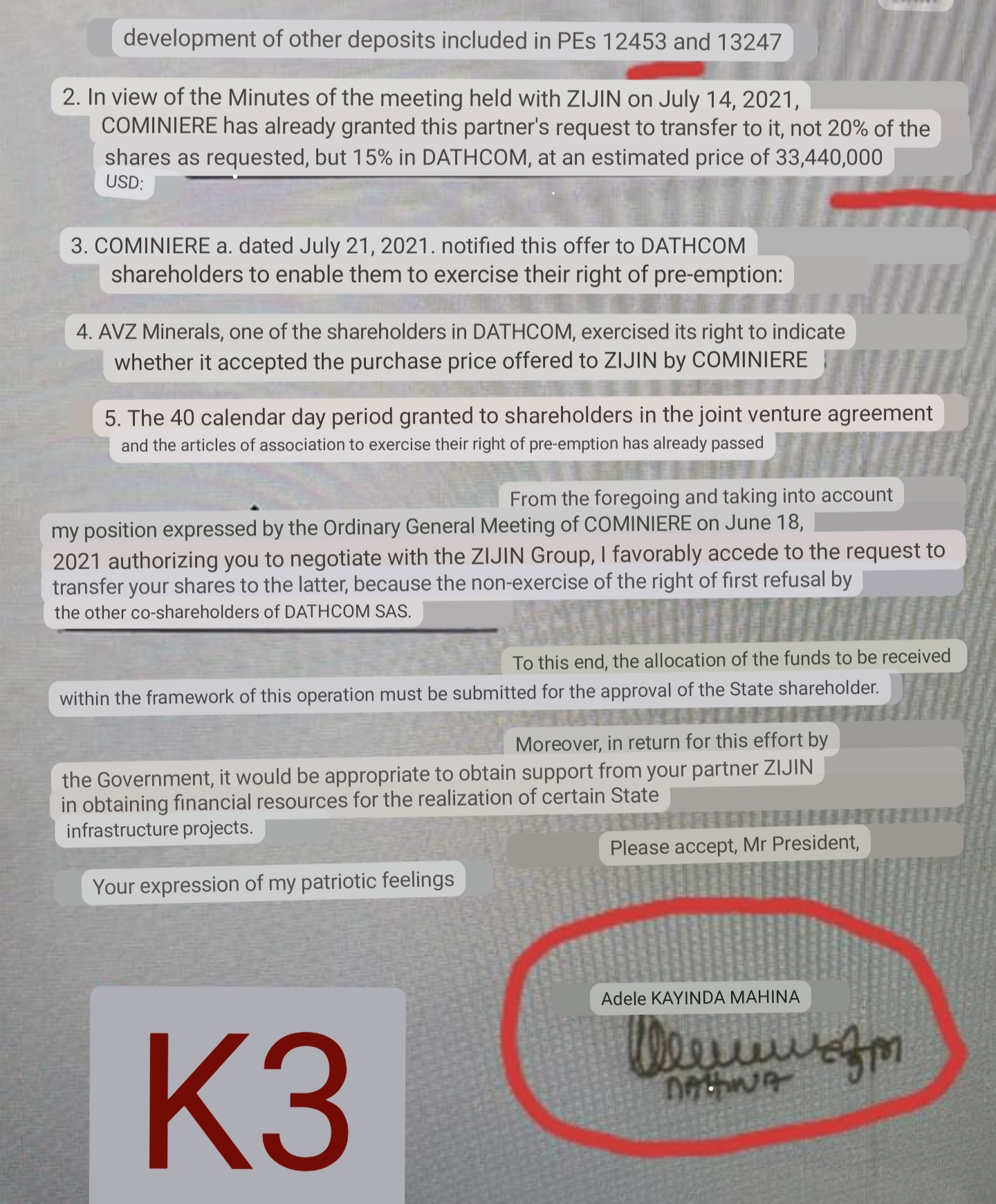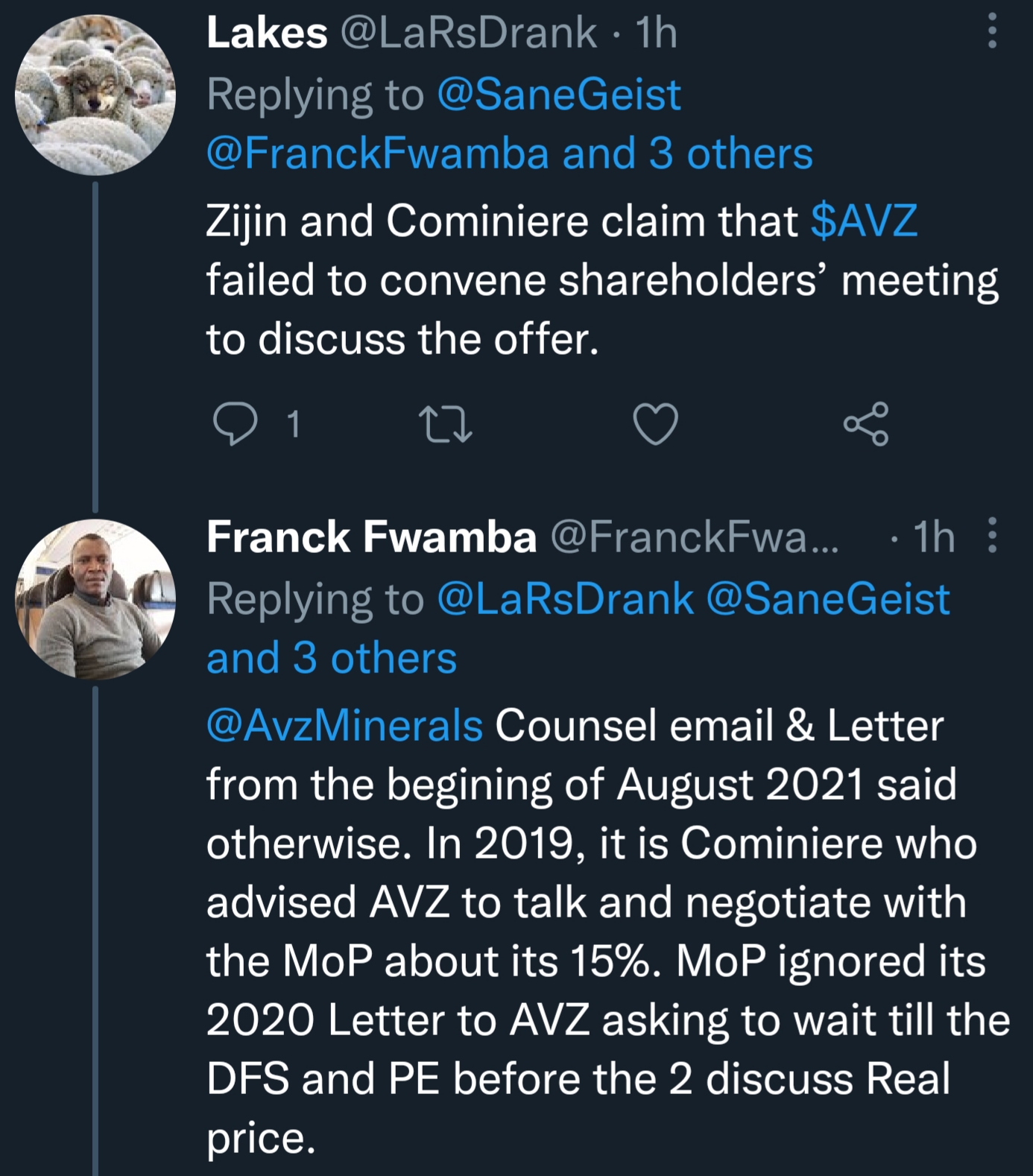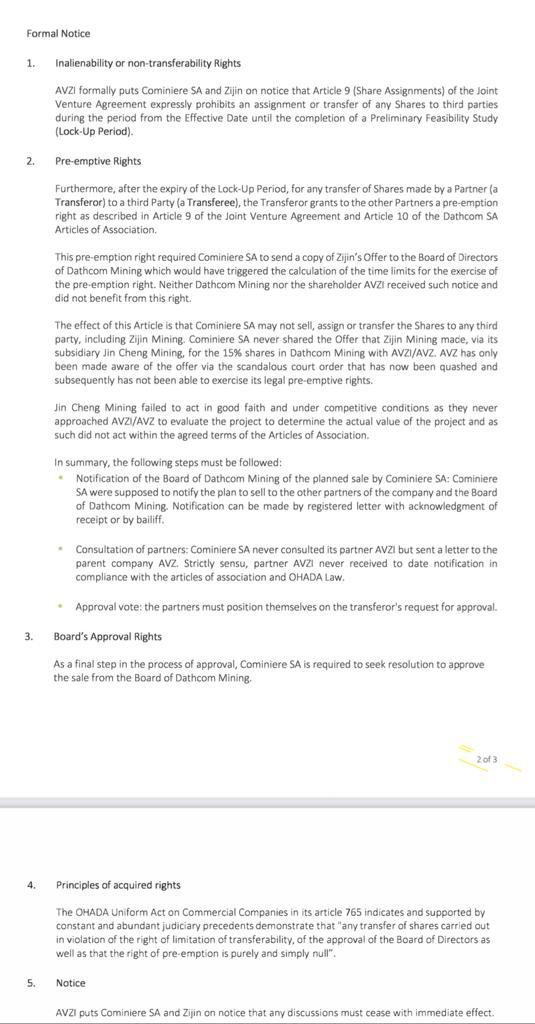 It is Cominiere that needed to inform us. As far as I can tell they told us that they were selling on July 21 2021 but didn't specify the price. We went back on August 4 2021 saying yes we want to exercise our FROR and asked what the price is. Cominiere didn't respond to that and when the 40 days lapsed they got the MoP to authorise the sale. We then submitted our offer on September 20 2021.Does Zijin have any proof that they informed us in July of their intentions? Do we have any letter from within the 40 days from this time? Because they seem to he saying hey we informed them in July and didn't hear back within the 40 days. AVZ's follow up letter isn't until November - would love to see what we sent earlier to claim our rights.
