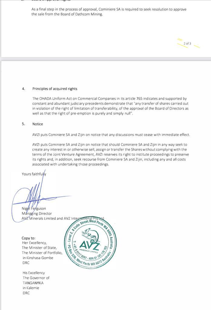 Did AVZ receive a letter from Zinjin, which technically should have gone to AVZI so AVZ took no action? Surely not.Does Zijin have any proof that they informed us in July of their intentions? Do we have any letter from within the 40 days from this time? Because they seem to he saying hey we informed them in July and didn't hear back within the 40 days. AVZ's follow up letter isn't until November - would love to see what we sent earlier to claim our rights.