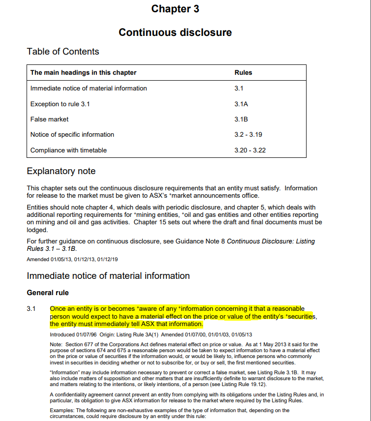 AVZ are specifically and actively not adhering to the Chapter 3 continuous disclosure listing rule as they are concerned that confidential, privileged and legal information is leaking to non-national opposing entities during the discussion and negotiation process with the relevant DRC parties