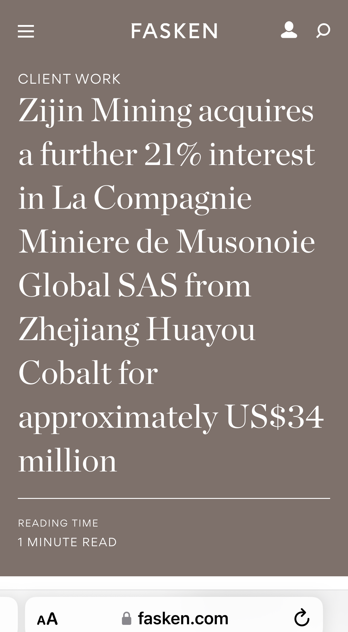 On August 26, 2016, Jin Cheng Mining Limited, a wholly-owned subsidiary of Zijin Mining Group Co., Ltd., acquired a 21% equity and other related interest in La Compagnie Minière de Musonoie Global SAS, from Zhejiang Huayou Cobalt Co., Ltd. for approximately US$34,000,000. La Compagnie Minière de Musonoie Global SAS is a Democratic Republic of Congo based copper mining development company. Following the transaction, Jin Cheng Mining Limited owns 72% of this company. Fasken represented Jin Cheng Mining and Zijin Mining in this transaction with a team that included Michael Boehm, Lei Huang, Daye Kaba, Dan Su and Félix-Olivier Hébert.