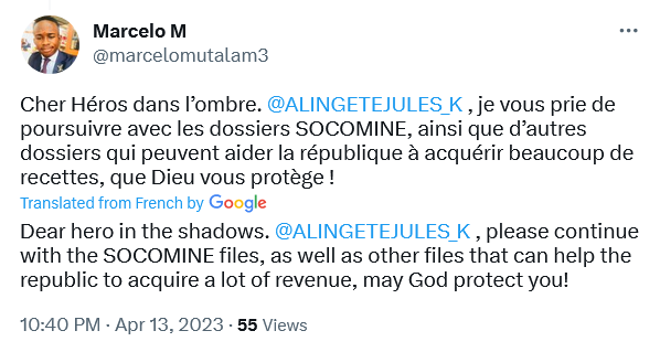 "the companies HONG KONG YISEN and HONG KONG EXCELLEN MINING INVESTMENT CONGO SARL as well as certain parts of the Reports of THE BOATMAN CAPITAL RESEARCH, GLOBAL WITNESS of December 2021 and THE SENTRY of November 2021 on DATHOMIR MINING RESSOURCES whose headliner is Chinese Simon CONG MAO HUAI. Mr. Guy LOANDO, current Minister of Regional Planning, has direct or indirect interests with Chinese, to be identified by our security services (including the ANR which does good work against predators), in these three companies. Our organizations think that he is in conflict of interest, he has benefited irregularly from the mining assets of COMINIERE, the sale of which is denounced as illegal in the IGF Report which depends on your authority.