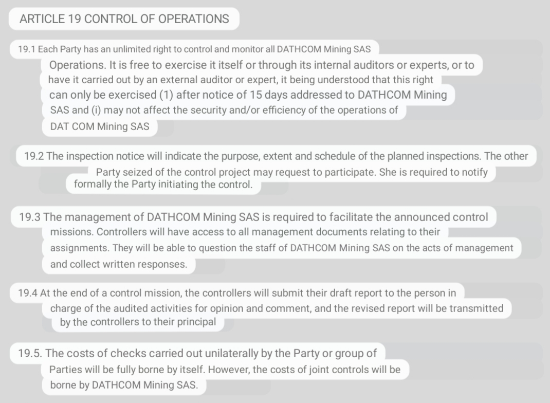 • 19.1 Each Party has an unlimited right to control and monitor all DATHCOM Mining SAS Operations. It is free to exercise it itself or through its internal auditors or experts, or to have it carried out by an external auditor or expert, it being understood that this right can only be exercised (1) after notice of 15 days addressed to DATHCOM Mining SAS and (i) may not affect the security and/or efficiency of the operations of DAT COM Mining SAS”