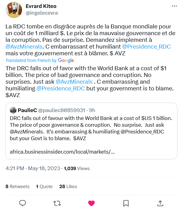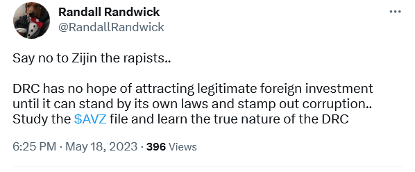 The twitter campaign is gathering support from stakeholders and is being very well supported by locals in the DRC, it has specifically targeted Celestine Kebeya and Zijin which is spot on, but I’m thinking of targeting the government and mining sector as a combined corrupt entity.