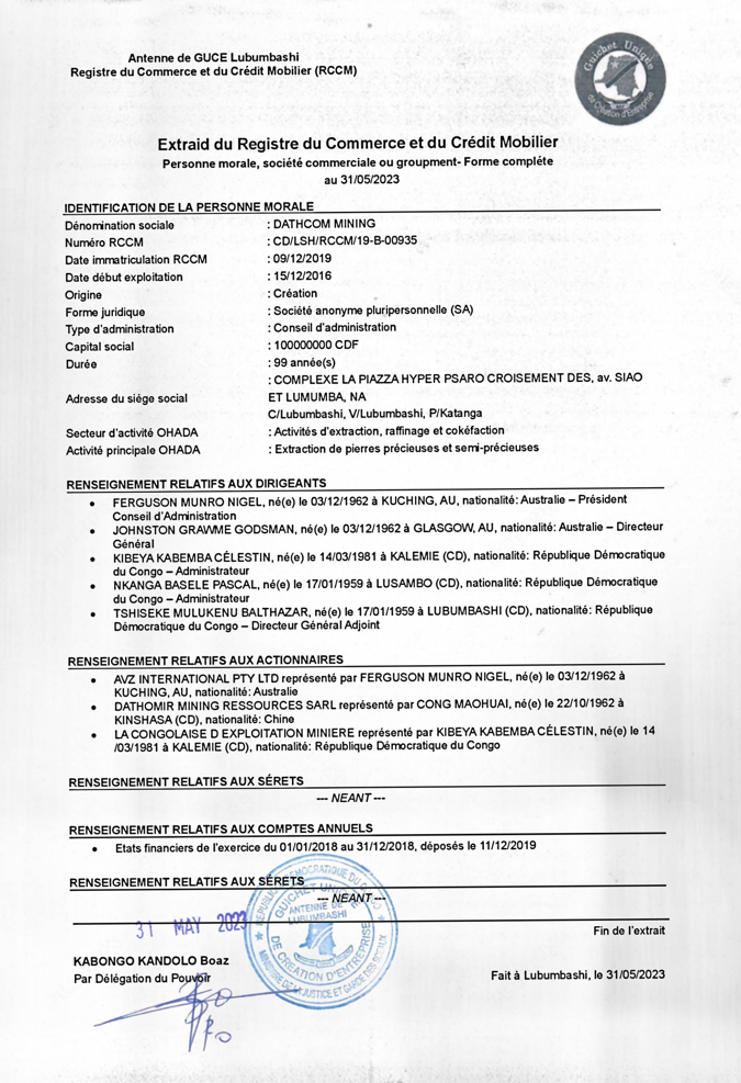 31/5/23 also printed in the doc title. If this is an updated company registration can't work out why Dathomir is included. Suspect we'll know soon enough, deserves an Ann IMO.Nice that this document is already pre-stamped with a seal and then dated and then printed before a signature attached. Yet that is not uncommon in Africa I guess. Hmm