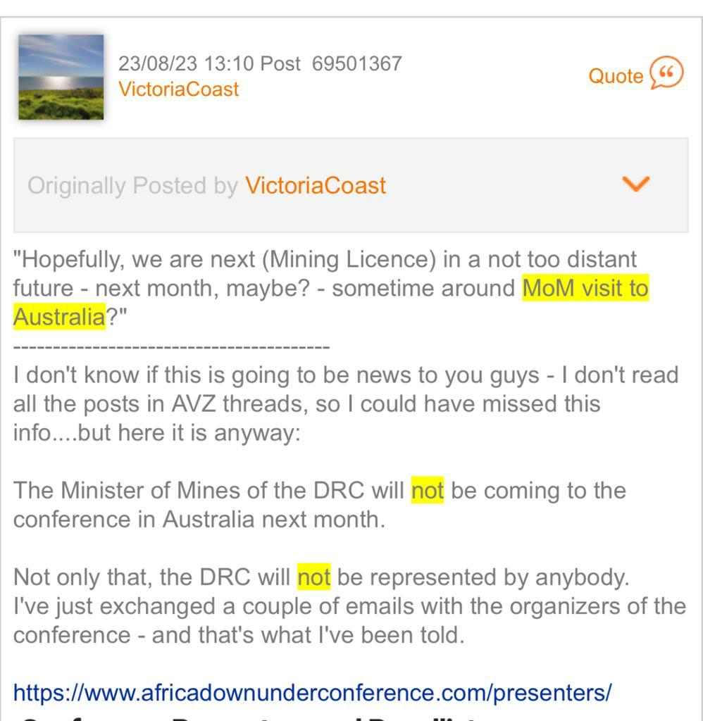 not wanting to be a debbie downer like wombie, dont think the mom visit to aus is necessarily a negative thing. If you think about it, whatever happens to avz in the next few days is not going to take the stench of corruption away from the DRC. It would make more sense to visit aus once they have settled avz AND have a track record of orderly and non corrupt dealings over a period of time, in essence they need to rebuild trust in the international mining community and this isnt going to happen overnight. So it would make perfect sense to me, for the mom to reset for the next africa downunder in 12 months once they have established a track record so the mom's words might actually believed. this is of course my harry happy positive spin.