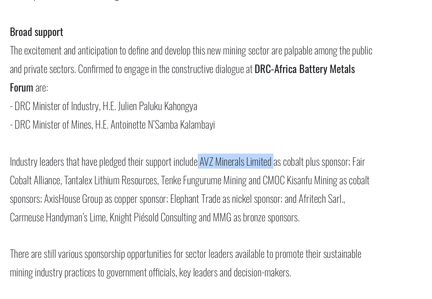 Just beggars belief AVZ is still a sponsor of that event, if indeed AVZ doesnt have a future with the DRC battery metal hub as Cominiere portrays..........