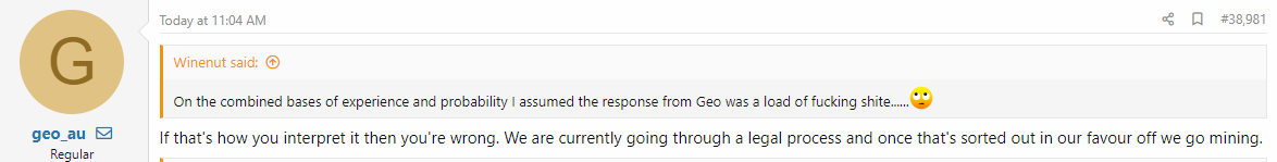 Do BODs at any AGM really provide any meaningful response to shareholders' questions on such topics? My mind goes back to the one of the previous AVZ AGMs where this came up, and Nigel handballed the question to Hjulich, who gave some kind of non-answer. They all had disdainful /dismissive expressions on their faces. Will it really be any different this time (apart from H providing the answer