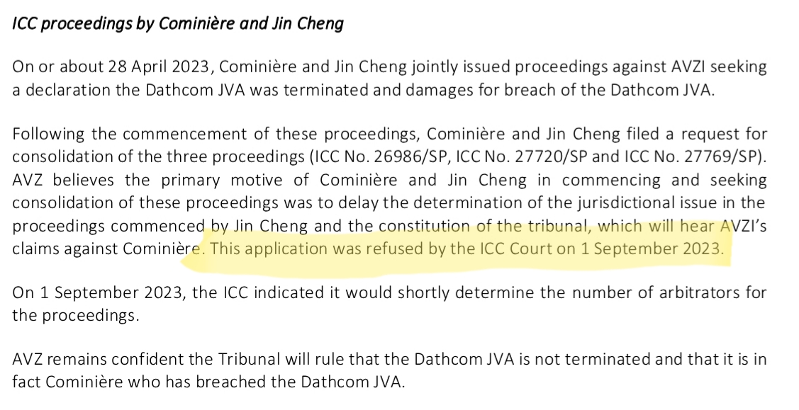 It's been a long road to get here so here is a recap of how we arrived at this point for those unsure of the facts of the caseThe fact that the ICC refused to merge these cases plus the damages case brought by Zijin and Cominiere against AVZ is bad news bears for Zijin imo