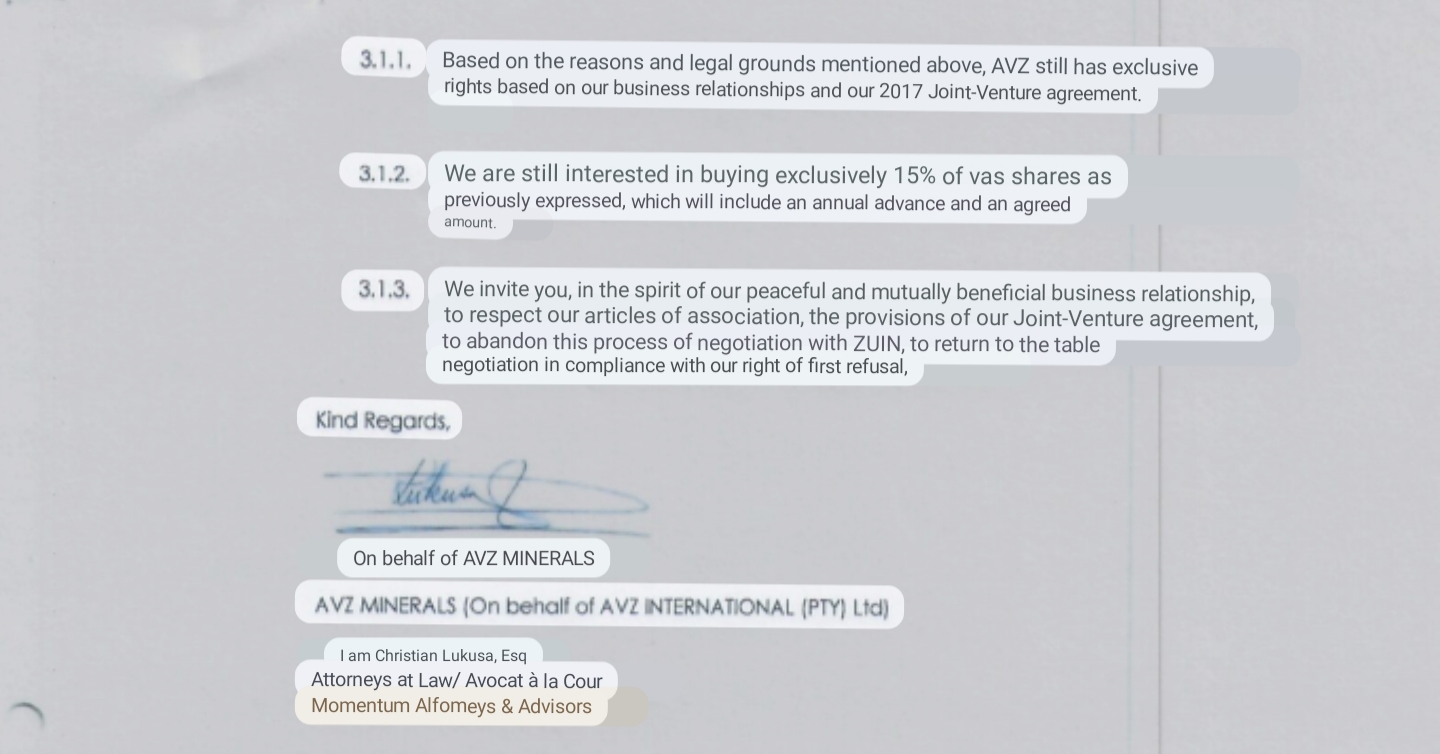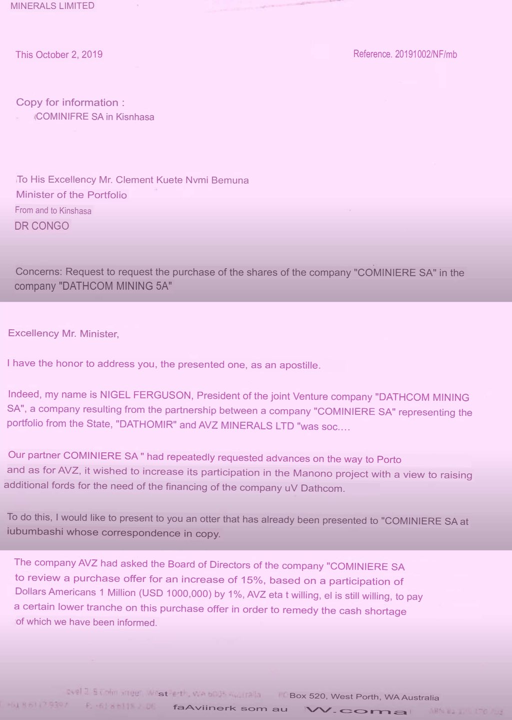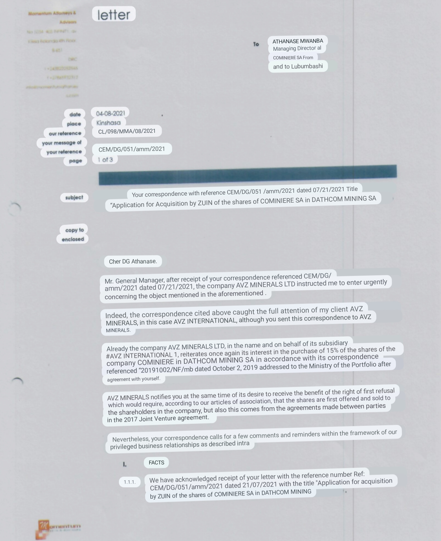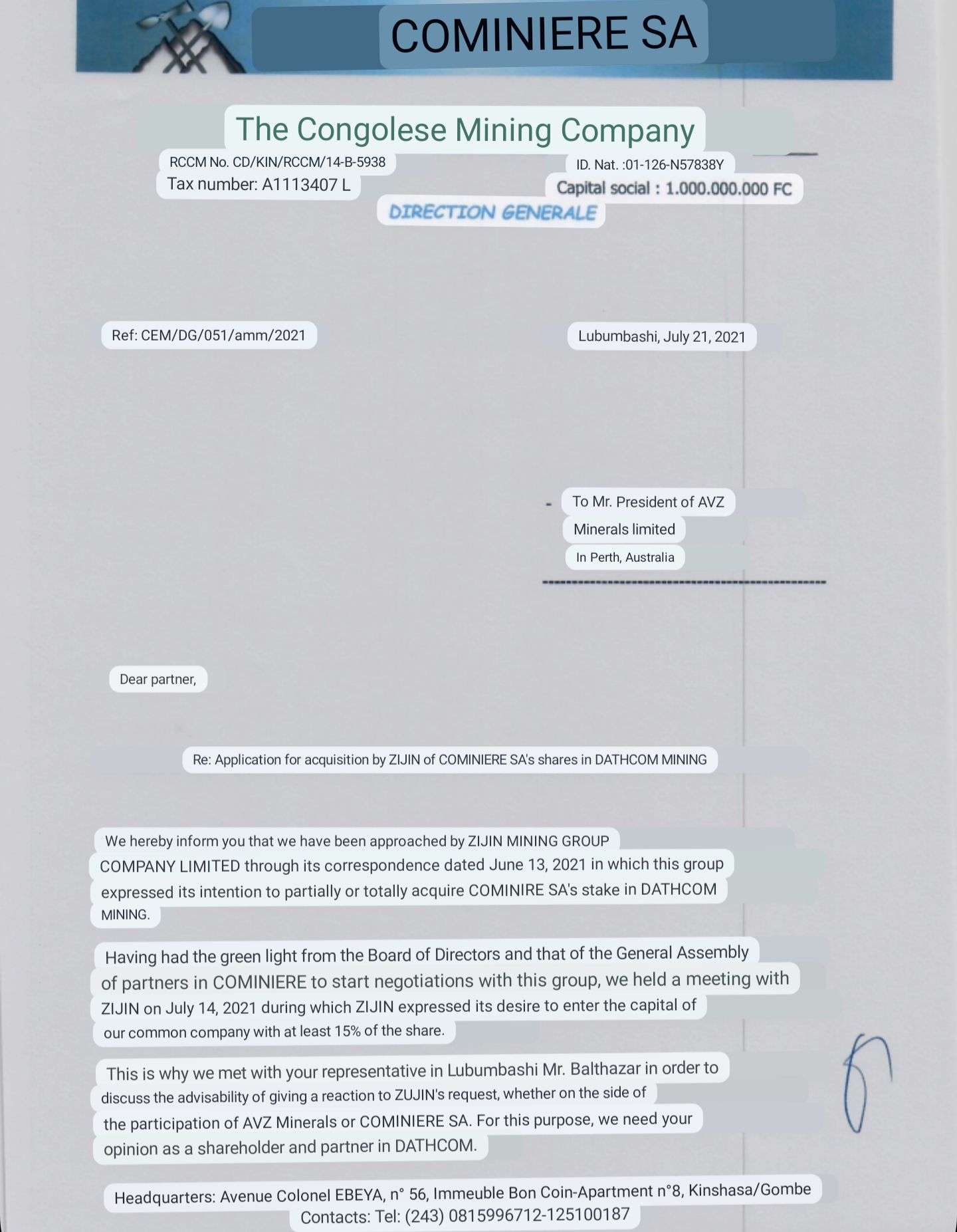 Here is AVZ's response through our lawyers on August 4th 2021 to Cominiere's request for an opinion on Zijin buying 15% of Dathcom. Note the reference to the MoP letter from February 2020. Crucially this was sent to Cominiere within the 40 day window outlined in Article 9.1 (b) of the Dathcom JVA. Cominiere never responded to this letter.