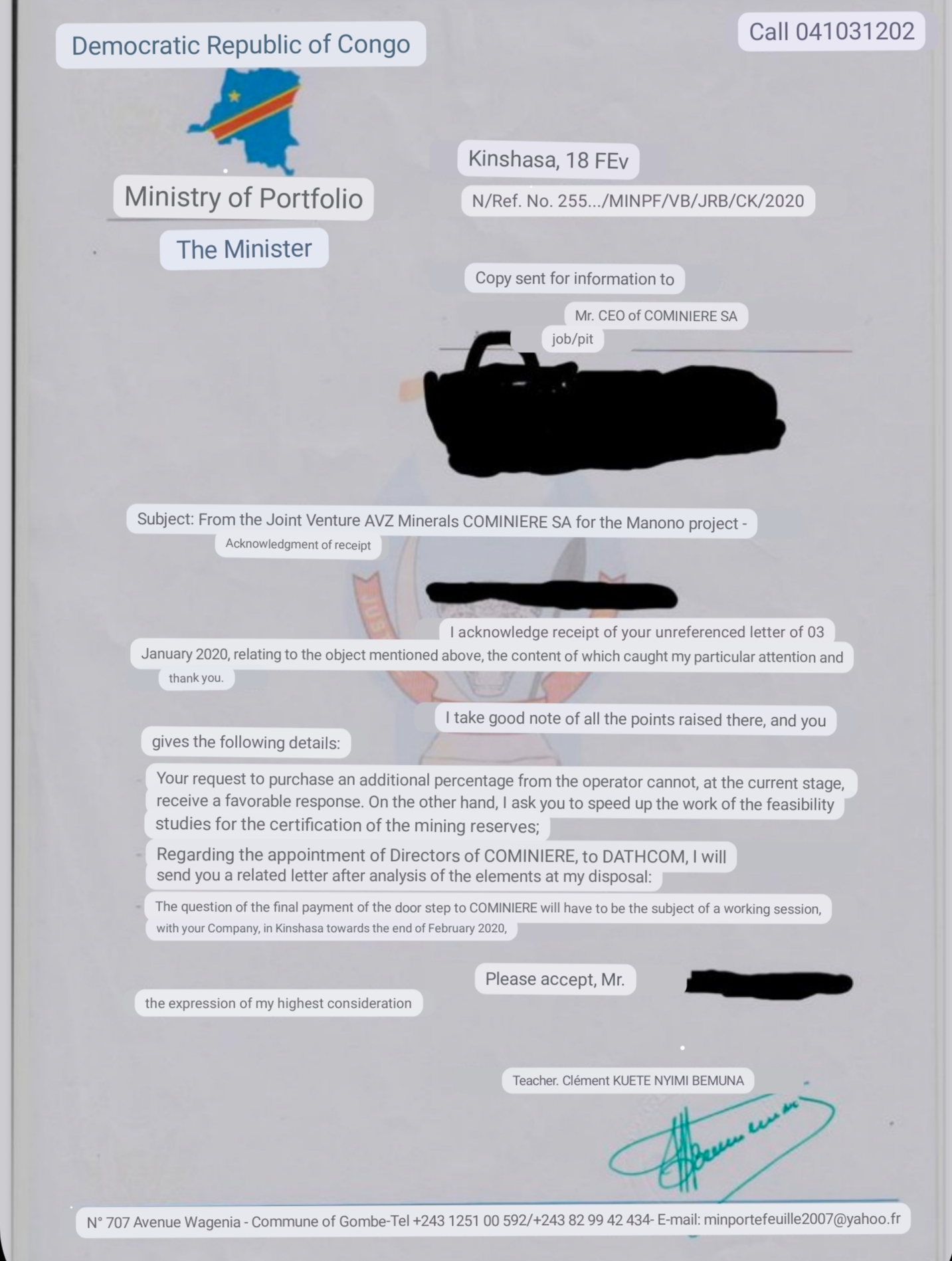 This was his response on February 18 2020. Note his reference to the DFS being completed before the sale and the DRC government's intent to hold a working session to determine this matter.