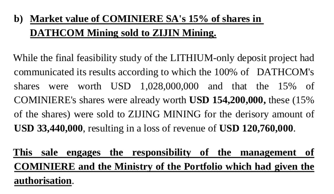 Fast forward to July 21 2021 and AVZ are contacted by Cominiere about giving an opinion on an offer they have received from Zijin for the 15%. They also ask us for an advance on dividends which can only be described as batshit insane. Crucially no price for the proposed acquisition is given by Cominiere despite market value now being known from the DFS which was released in April 2020.