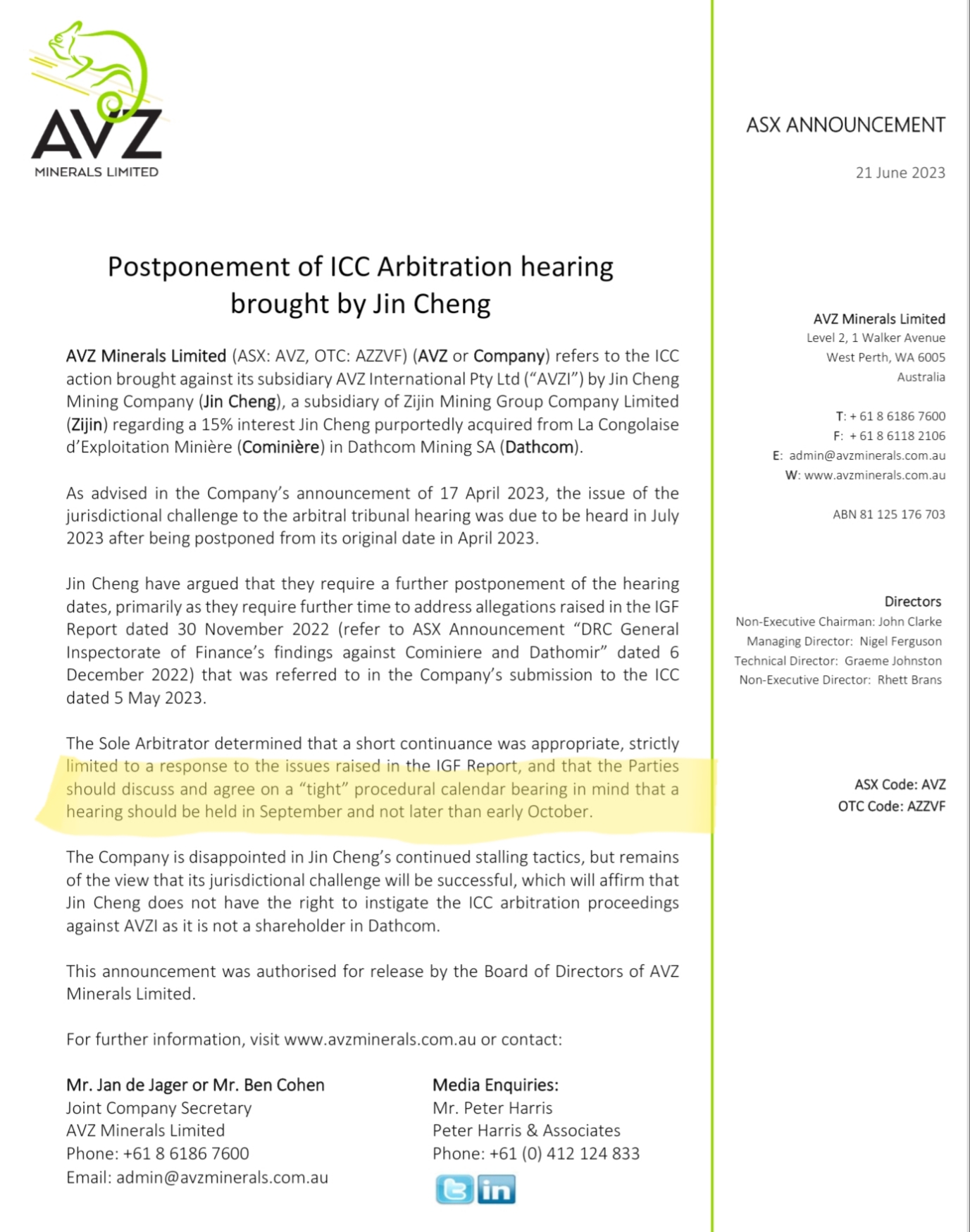 What's the consensus, will Zijin admit defeat and back out of ICC proceedings today? Or do they push ahead with the hope of disrupting, draining and delaying $avz at all costs?