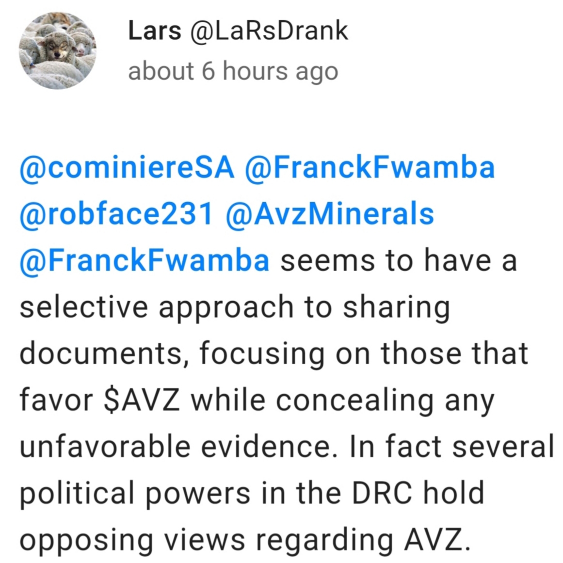 Agreed we should have an $avz presence on ground - not pleasant but it's their job? Nigel and Ben in Kinshasa no doubt which is still a shithole i'd imagine. Not sure Graeme has been in country in several years? Michael Hughes used to be onsite and physically stopped a few Zijin fuckwits with a bulldozer, then he left the company for whatever reason.