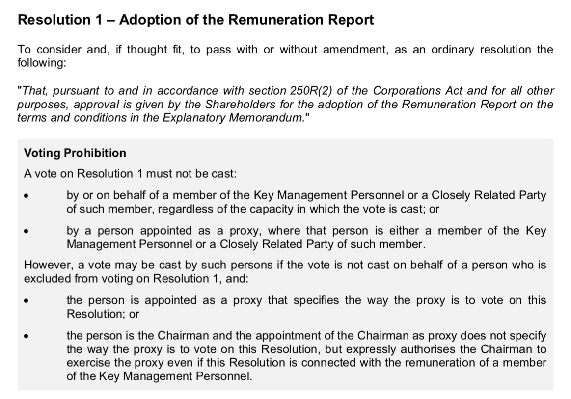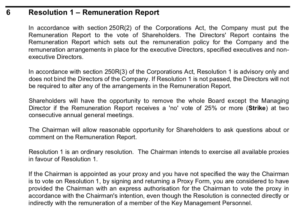It's a vote on the entire remuneration report as outlined in the annual report. If two consecutive no votes at AGM's of 25% or over are recorded the board gets sacked. Basically they are just asking us if we approve or not either way it has already been paid.Could someone outline what resolution 1 refers to exactly?