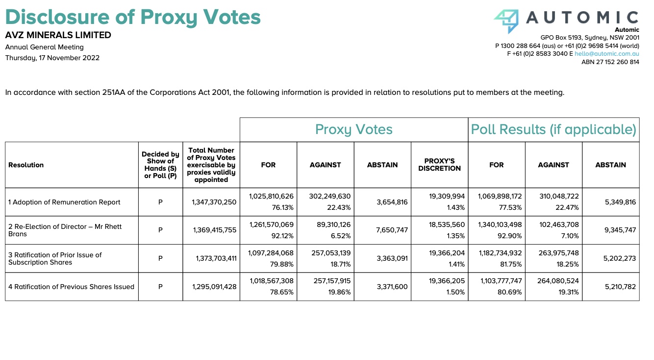 Anyone knows last year % of NO vote for Remuneration and if this was under or above 25%?It's a vote on the entire remuneration report as outlined in the annual report. If two consecutive no votes at AGM's of 25% or over are recorded the board gets sacked. Basically they are just asking us if we approve or not either way it has already been paid.