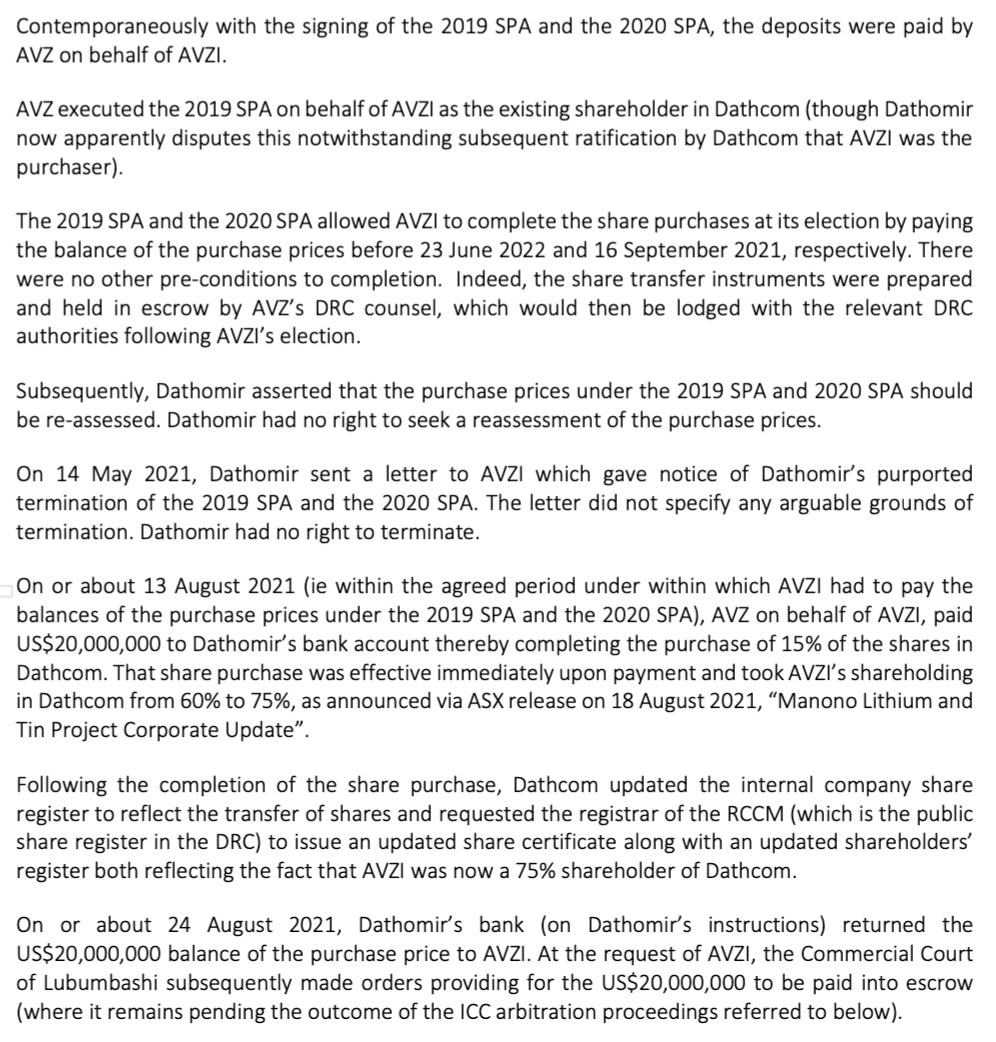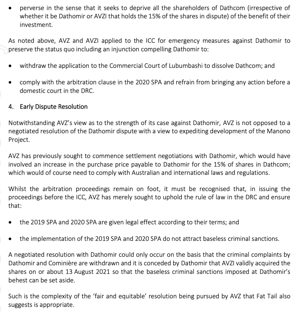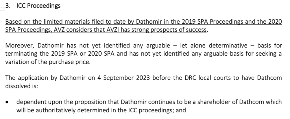 Article 11.1 of the Dathcom JVA is very clear. Disputes must ho through the ICC. And I'm sure the SPA's contained the same clause. The fact that Cong decided to go through the back alley courts within the DRC instead of going to the ICC and the fact he doesn't want the ICC decision made public but AVZ and the ICC do says it all. I seriously doubt DLA Piper have this wrong.