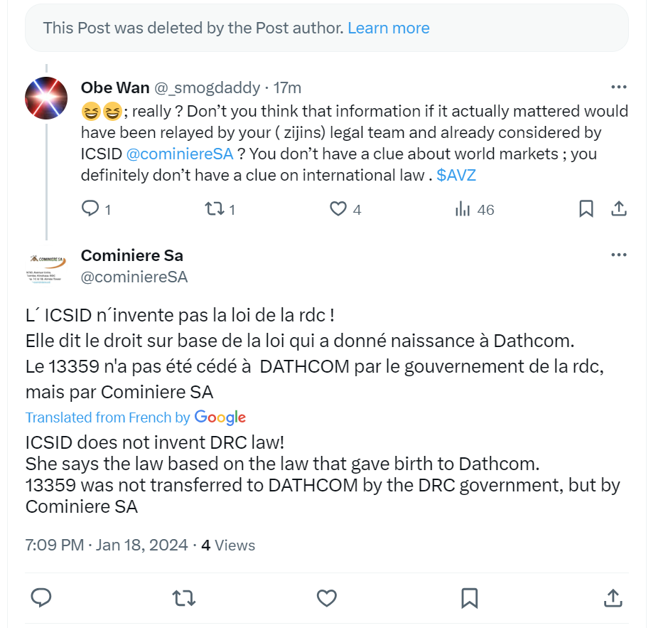 So Cominiere sells part of 15775 to Zijin (and becomes Manono lithium), ICSID says AVZ owns the lot so this becomes a dispute between Cominiere and Zijin! Nothing to do with AVZ and beyond the scope of the current proceedings. Am I reading this correctly?