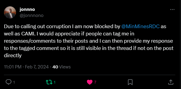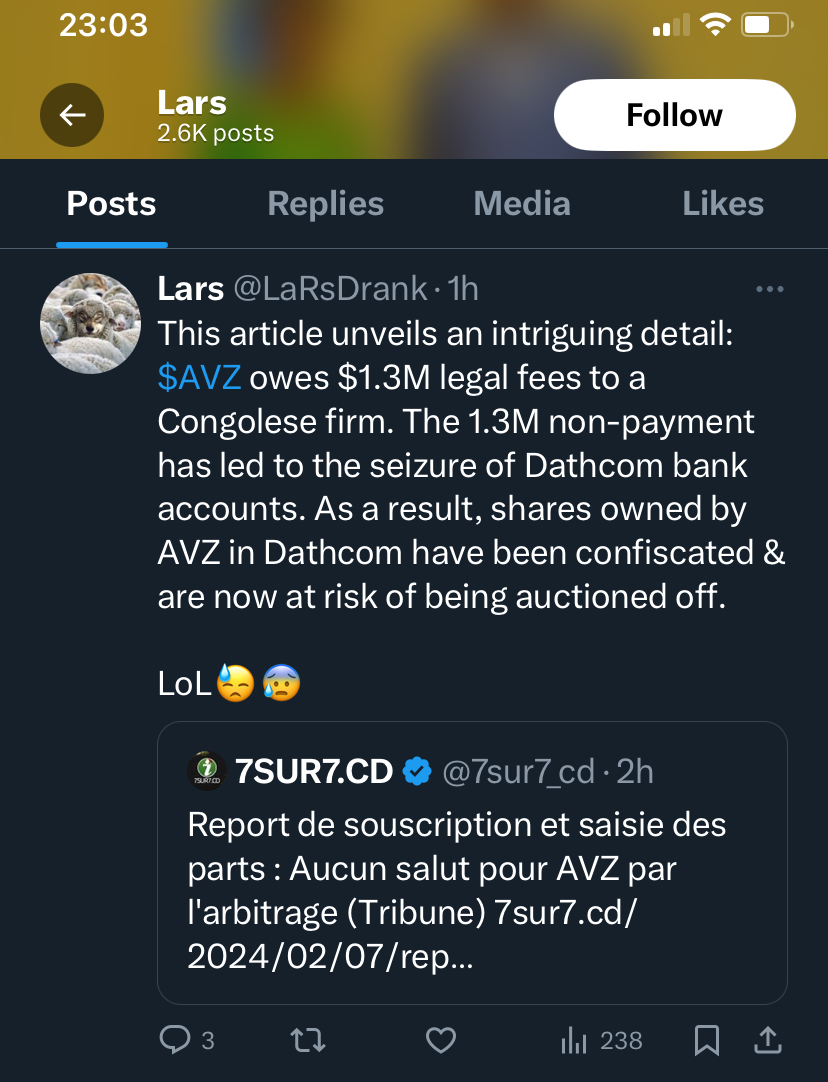 My opinion on the AVZ situation continues to be, if there was a way that DRC could have removed us and commenced mining on RD and/or CDL, that action would have happened by now. RD especially is ready for shovels in the ground. There is obviously a consequence/missed opportunity to great for above to occur.