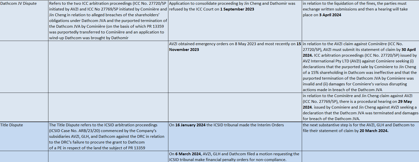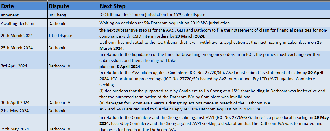I'm keen to see if Dathomir withdraw their application to have Dathcom JV terminated in Lumbashi on the 25th March. That's a definite date, with a specific action in regards to interim orders. Let's see if it eventuates.