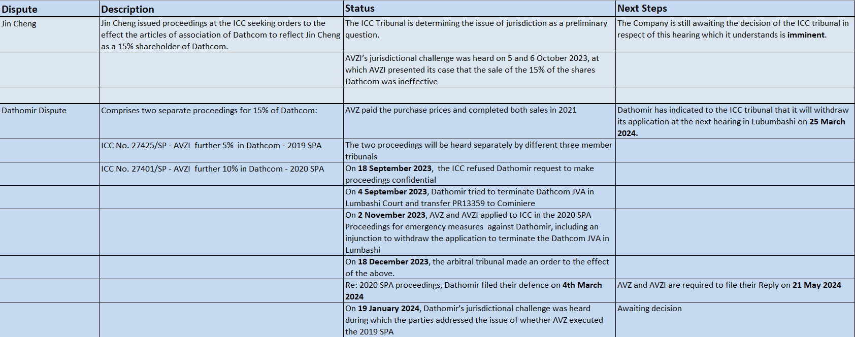 The " imminent " decision regards to ROFR Jin Cheng is the key , many posters here have said in the past that a positive decision in favour of AVZ could be a domino effect in throwing out the Dathcom JV dispute brought on by Jin Cheng / Cominiere and prompt the newly formed DRC govt to get back on the negotiating table, with AVZ holding a strong hand.