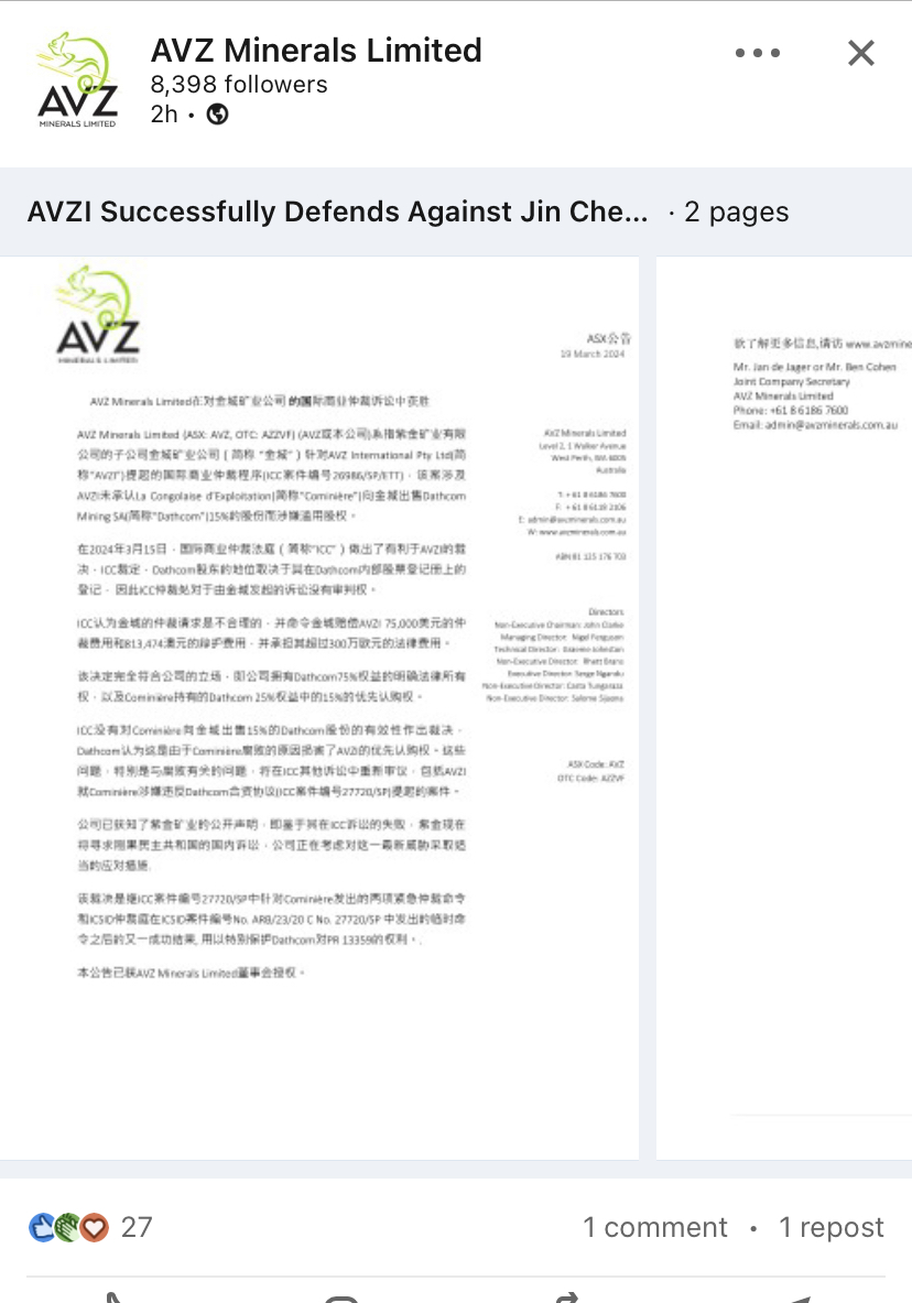 I can't help but think the truth will come out and AVZ plight will be known throughout the world making it almost impossible for the crooks to prevail. Down rampers will rabbit on about Sundance and other African deals that have gone sour but with the Advent of social media and the speed that information is dispersed and directed there is nowhere for the crooks to hide. The pressure we can apply from our lounge rooms is unprecedented and relentless. This awesome bit of journalism will be flying around Africa, Europe and the US as we speak. Specifically targeted (tagged) at those who can influence or be influenced. I have said before that this deposit is too valuable to be gifted to the CCP and used against the west in the war for for control of critical minerals. AVZ will prevail one way or another. IMHOThis is now evidence that the trolls/shorters/scumbags have no idea what's really happening and just latch on to any negative sounding info re AVZ and parrot it to spread FUD. Tommy reportedly originally posted about upcoming 'bad' news (then edited), which was then parroted on X by 'Iggy Bliss', 'lithiumking' and 'SPECCAPITAL'. 'SPECCAPITAL' deleted it shortly after posting. They were all saying on X that reportedly 'bad news' was coming re ICC verdict. 'LarsDrank' posted some tweets [curiously] in line with some of the concerns myself and @Winenut raised on here (very shortly after we had posted the questions) ie re @Carlos Danger's post last night when news of ICC leaked via Chinese article. Lars' tweets had a negative spin on the news too, ie the interpretation that ICC didn't have jurisdiction and deferred it to DRC court - which appears is not accurate.