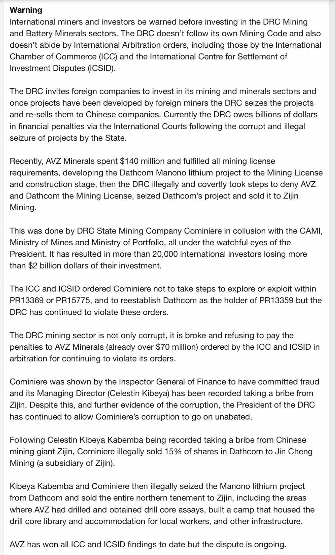 Warning International miners and investors be warned before investing in the DRC Mining and Battery Minerals sectors. The DRC doesn’t follow its own Mining Code and also doesn’t abide by International Arbitration orders, including those by the International Chamber of Commerce (ICC) and the...thestockexchange.com.au