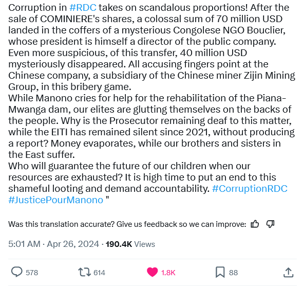 Ooh I’m loving how specific these original French tweets are getting - re naming members of the board of Cominiere etc. Seeing that really feels like traction is building from within the DRC which is exactly what we need. We can do as many English tweets as we like but the real power of change is going to come from them - they have the most to lose and the most to gain… Maybe the cogs are starting to turn!