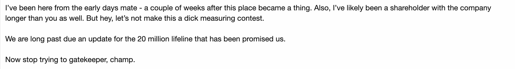 He informed me that the shackles are off and i can ask questions freely to the BOD, but he said that most of the questions i have, he could answer himself.....and like i said before, he was in a positive mood