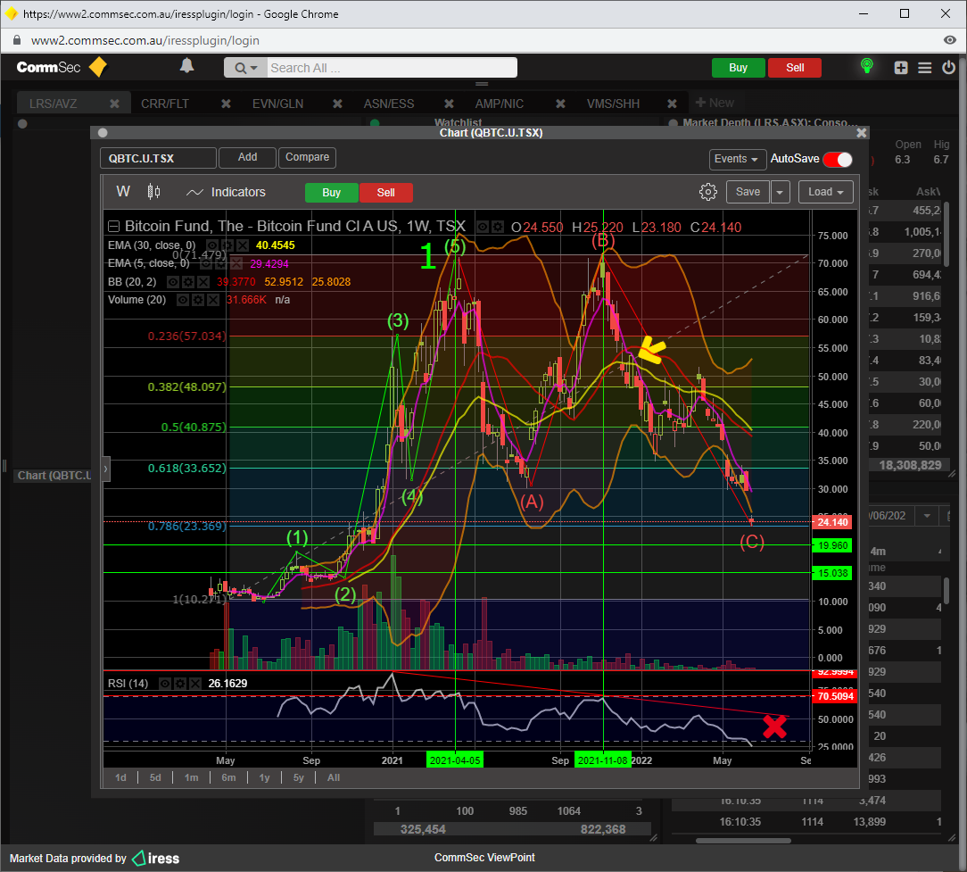 BITCOIN completed a set of 5 waves back in 5/4/21 ( main wave 1 up ) , RSI 14 got as high as 92 which was well and truly over bought ( anything over 70 ), so what goes up vertically, most of the time, goes down vertically, especially if there is little support on the way down, ABC wave 2 down can go rather low, in fact , it can go all the way back to just shy of the basement if the market is bearish enuff and would still satisfy EW rules.