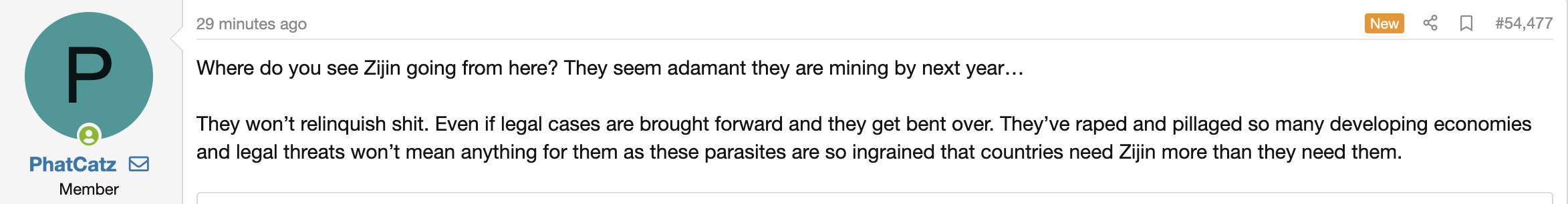@SilentOne its not defeatist to reach a negotiated outcome, I firmly believe zijin will remain with the north, they'll pay for it, maybe $200m, $300m, whatever but in the end only way to move forward in my view is to let go of that and move on. all speculation on here so time will tell