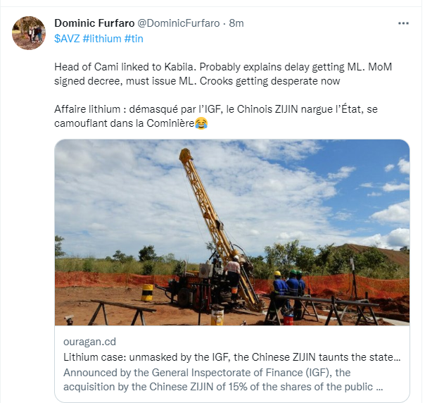 A consortium of civil society associations appeals to Félix Tshisekedi, "head of state and guardian of the mining interests of the population so that no official, from the presidency of the Republic to Cominière, does not use the traffic of influence … about Manono's lithium”. DATHCOM Mining is a partnership between Cominière and the Australian AVZ Minerals which has made a financial package of 545.5 million dollars to build the lithium extraction plant in Manono, with the help of another Chinese operator, Suzhou. CATH Energy Technologies. DATHCOM plans to produce 1,600 tons of lithium spodumene (SC6) per day, starting in the last quarter of 2023. The plant could generate 500 direct jobs and 2,000 to 5,000 indirect. AVZ Minerals obtained, at the beginning of May 2022, from the Minister of Mines, Anto Samba, the transfer of its research permit into an exploitation permit. But the movement of civil society fears red tape at the Mining Registry (CAMI), which until the end of May had not yet notified AVZ Minerals of its new permit. It should be recalled that the DG ai of CAMI, Jean-Félix Mupande has been in his post since the 1+4 regime and remains there despite state decisions (including an order from Kabila and an order from the current minister des Mines) relating to his replacement. Mines in the DRC are an area of conflict of interest, often to the detriment of the state, deplore civil society associations.