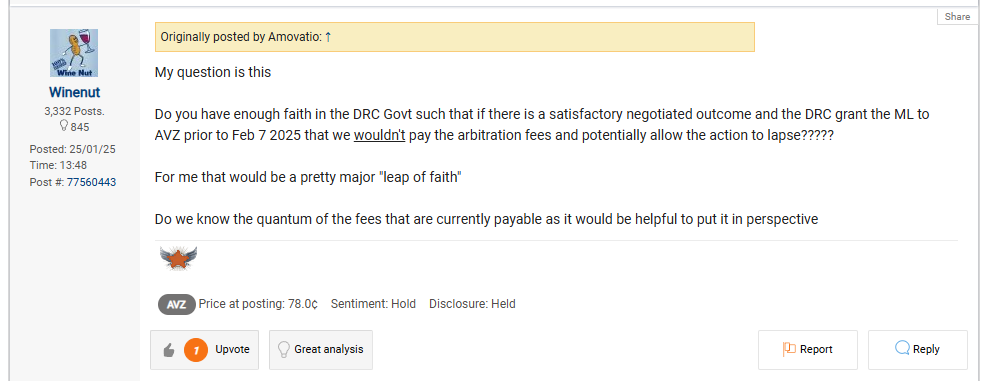 I believe in the BOD and l'm positive of the outcomes of ICC and ICSID in the future. I f negotiations or sale are in the background so be it. I am leaning towards going the whole hog via the Courts to teach the DRC a lesson, send them bankrupt for the World to see, several end up in jail so then maybe they can get on the right path for their people but that is me just dreaming.