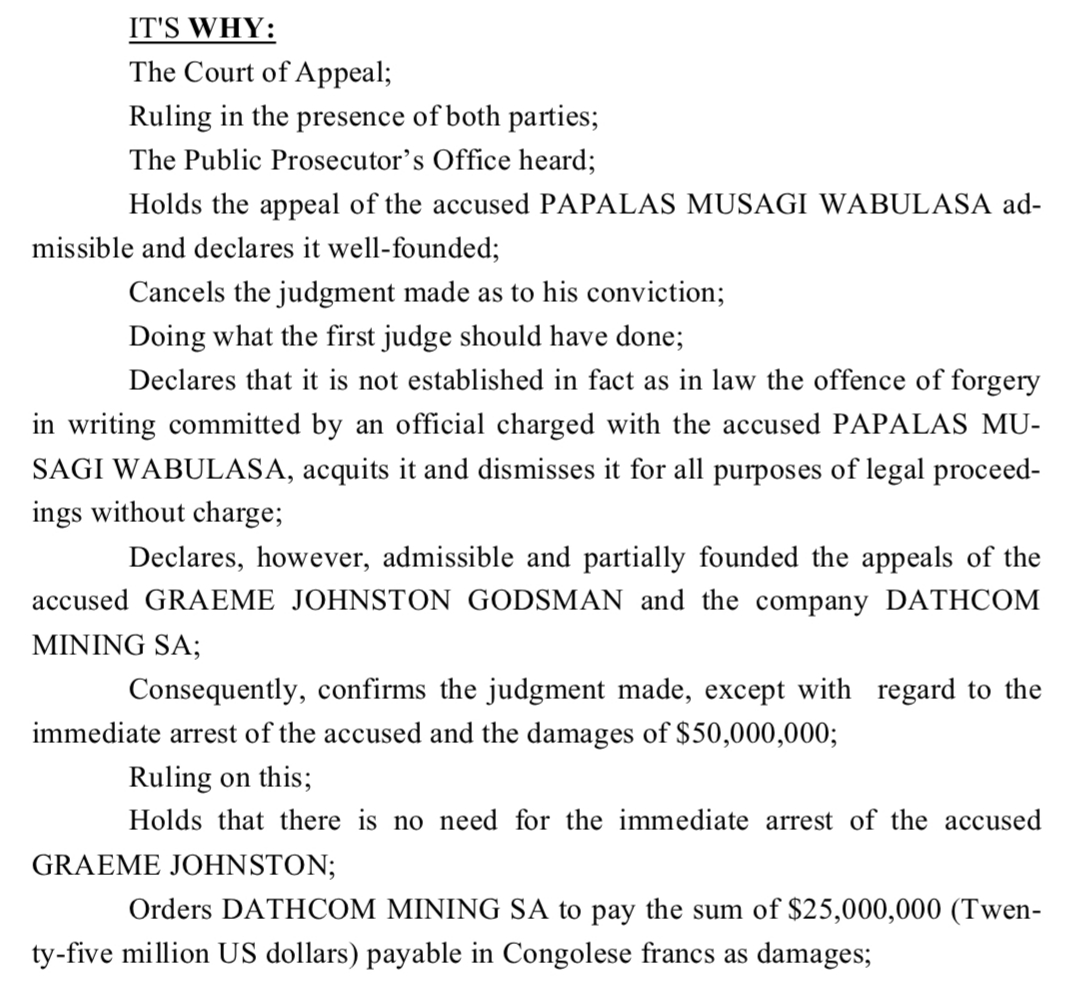 Need for immediate arrest of Graeme Johnston was overturned on appeal pending further appeal to DRC Supreme Court which will be heard after Dathomir ICC cases establish Cong is a moron imo