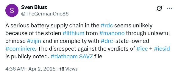 Re: https://www.theaustralian.com.au/business/mining-energy/perthbased-avz-minerals-congo-lithium-hopes-hinge-on-us-envoys-talks/news-story/8ef1498e0d201415a5c0286718bac360