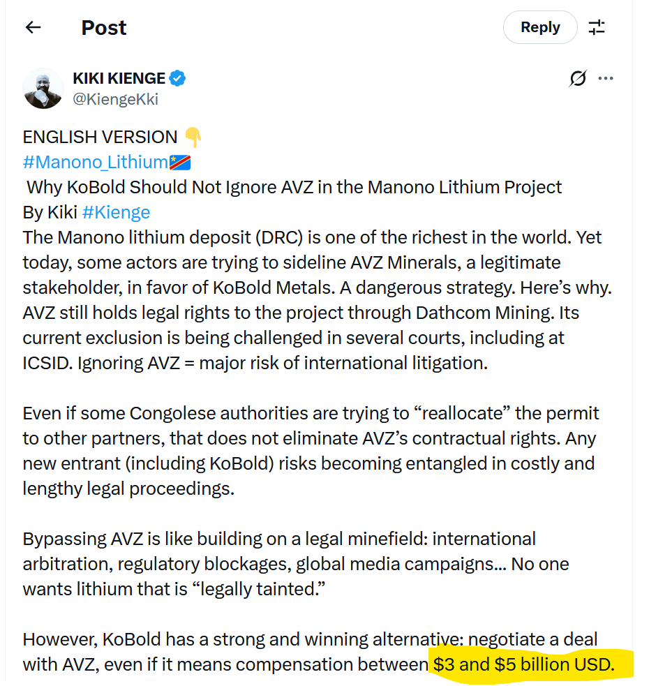 To be fair, I believe they valued Dathcoms destruction at 6.2billion, but now the USA has a planned minerals for security deal that derisks the asset and the improved mineralisation estimates should, in theory, be worth more than 6.2billionAndrew should let DLA Piper know that they got it wrong when they valued the destruction of AVZ’s 75% holding in the Manono project at $6.2b USD