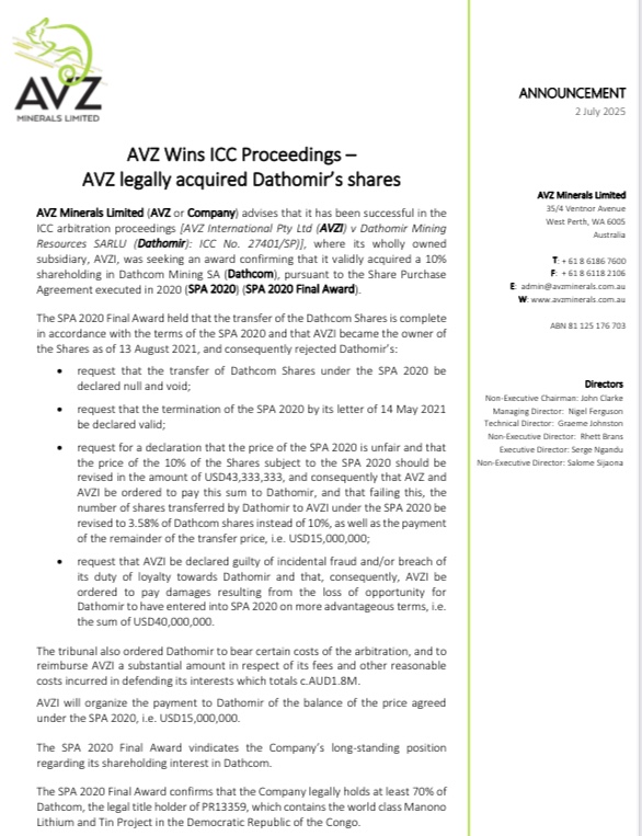 Carlos, I agree that AVZ completed the required steps and the SPA's were completed as confirmed by the ICC. However, I think the issue is that Cong was using the corrupt DRC legal system to try to reverse the agreements and whether this attempt/dispute needed to be disclosed.