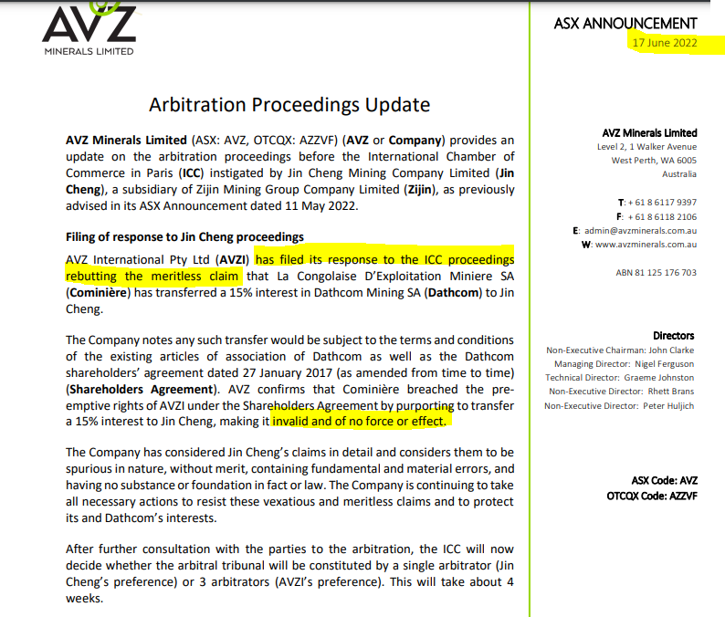 Arbitration will go ahead now unless Zijin discontinues their application. They have submitted their claim, AVZ have responded with their own submission as per the process and the statement in the announcement. At arbitration Zijin will get a chance to speak to their submission, as will AVZ, and then the tribunal decides. They may hand down a decision immediately or they may reserve the decision and publish it later. Will depend how complex the arguments are legally.